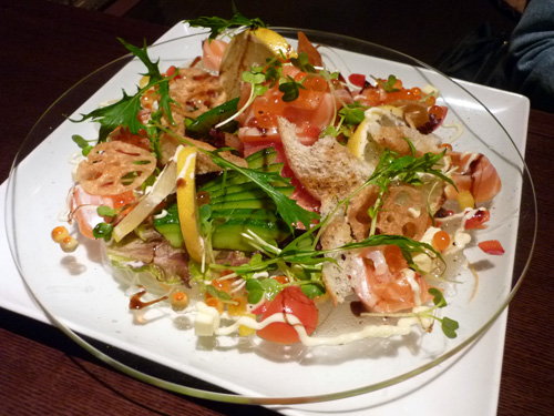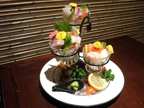 「お造りちょこっと盛り(1人前)」を注文すると女の子受けするようなとてもきれいな盛り付けだけど量が多過ぎ(^▽^;)
