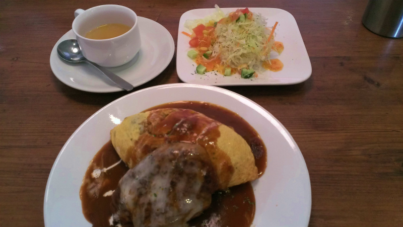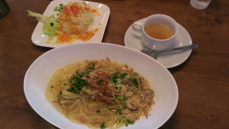 オムライスランチはデミハンバーグオムライス生パスタランチはごぼうのペペロンチーノ風スープ生パスタを注文。