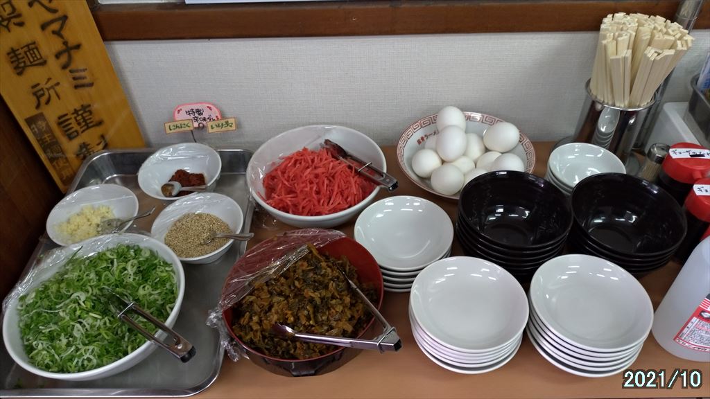 セルフのトッピングで葱・辛子高菜・にんにく・ごま・特製辛味ダレ・紅しょうが・生玉子がありました。