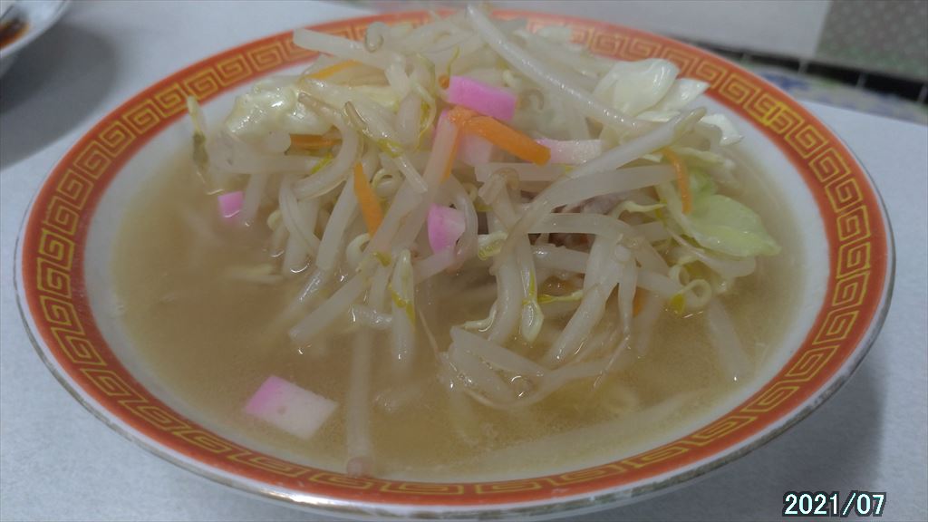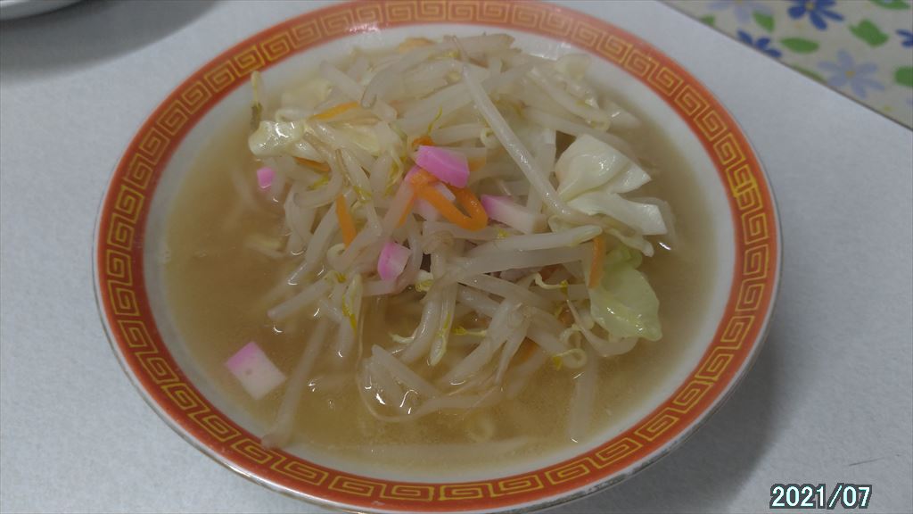 チャンポンはいりことかつおぶしのあっさりスープにもやし多めの野菜が入っています。