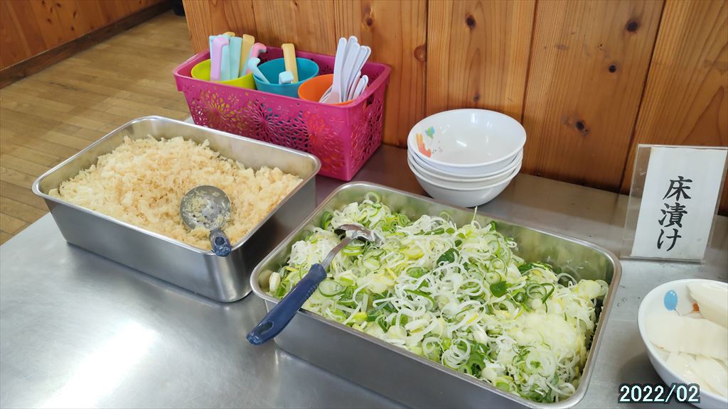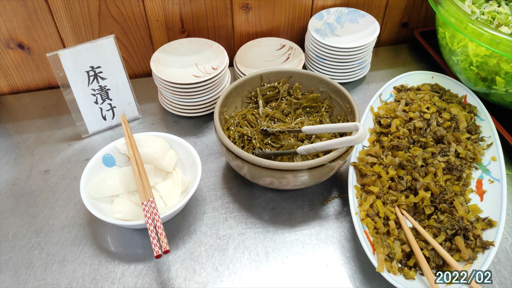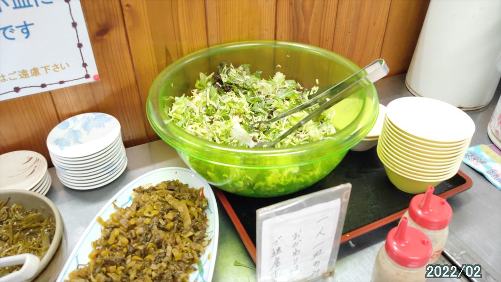 そのまま後ろのネギや漬物やサラダのコーナーに移動です。こちらは無料です欲しいものを取ってから席に着きます。