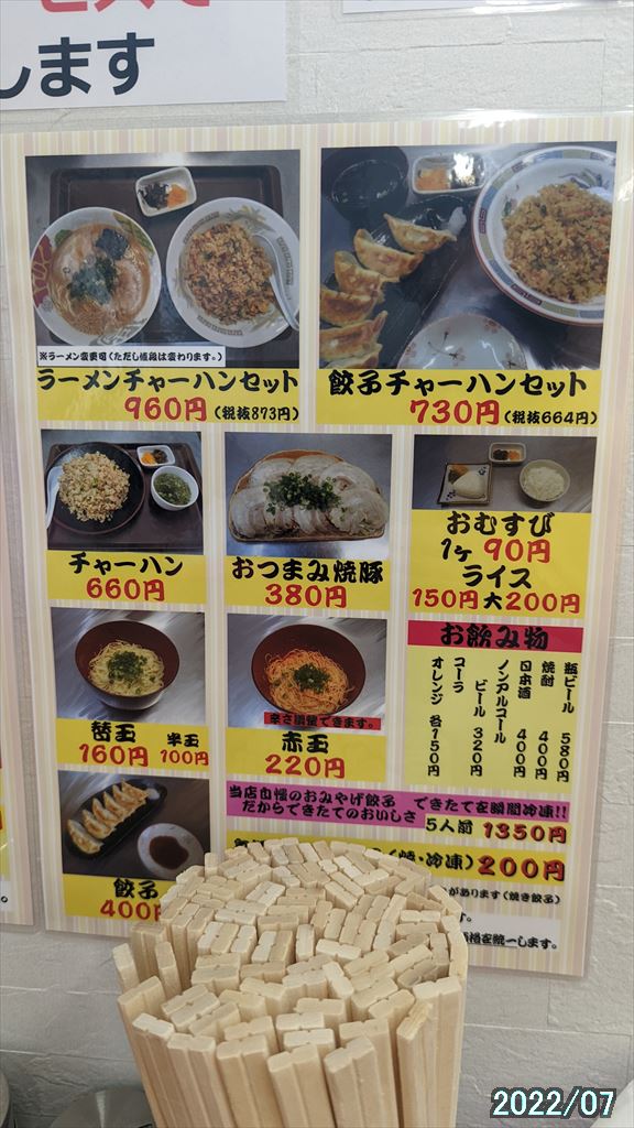 ラーメン・ラーメン大盛り・餃子・ライス小を注文。