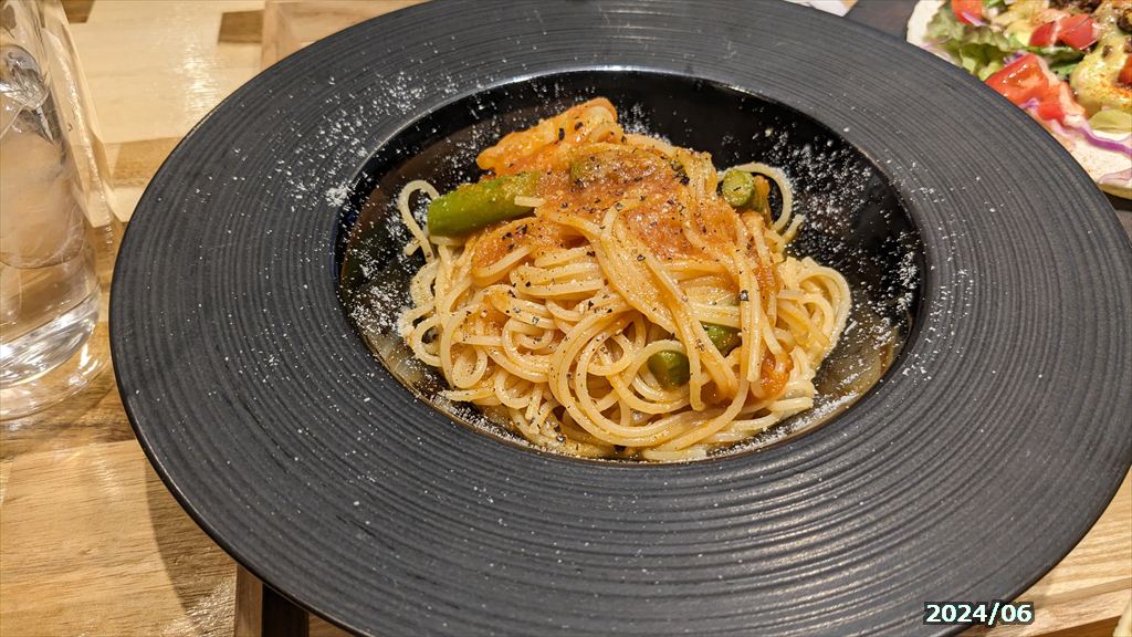 LAMPタコス&選べるパスタは海老とアスパラのトマトパスタにしました。